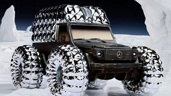 Специально для Недели высокой моды в Лондоне создали нестандартный вариант Гелендвагена. Об этом говорится на официальном сайте немецкого бренда. В его основе лежит старый Mercedes-Benz G-Class первого поколения, для которого решили пошить подобие "пуховика" серебристого цвета. В частности, крыша и огромные шины Mercedes G-Class имитируют "дутую" куртку. Кроме того, на крыше есть гигантская молния. Внедорожник имеет 4,6 м в длину, 3,4 м в ширину и 2,8 м в высоту. Масса - 2,5 тонн. | |