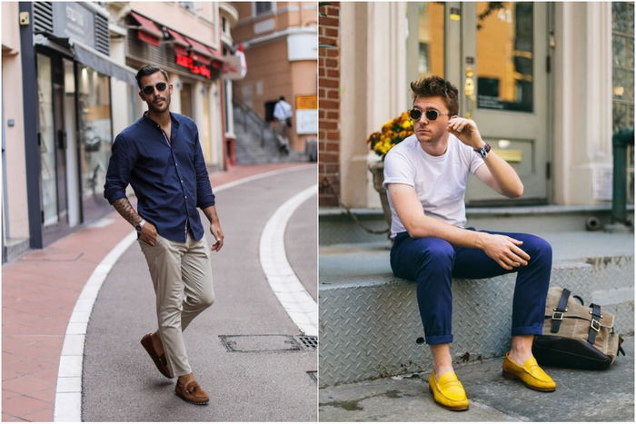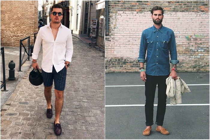 С чем носить мокасины: варианты образовПод что носить мокасины? Клубок не рекомендует носить такой вид обуви с откровенно деловой и спортивной одеждой. Классические костюмы, брюки со стрелками и выглаженные строгие рубашки будут лучше смотреться с брогами или туфлями дерби.В то же время спортивные костюмы также несовместимы с мокасинами и лоферами.