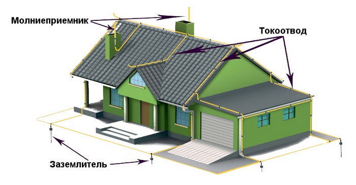 Устройство молниезащиты в загородном домеСистема состоит из связанных друг с другом элементов: