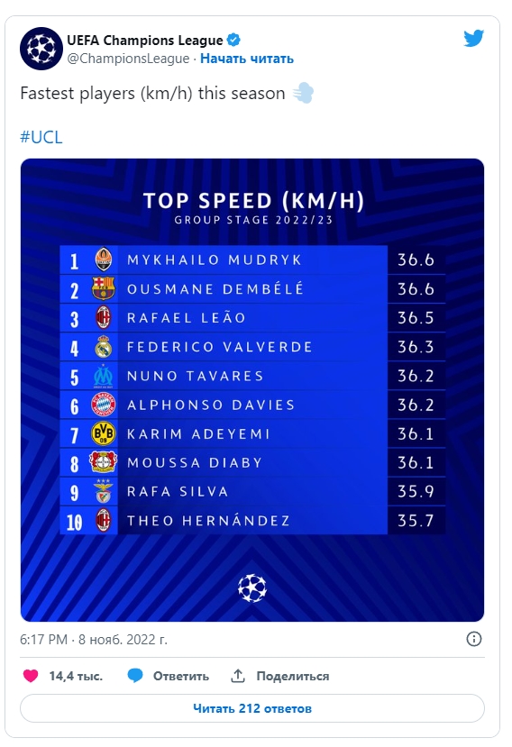 Михаил Мудрик продолжает поражать болельщиков и специалистов даже после завершения группового этапа Лиги чемпионов. Напомним, футболист вместе со своим Шахтером, до последнего тура вел борьбу за выход из группы с РБ Лейпцигом, однако в решающей встрече уступил немцам. И вот спустя неделю после завершения соревнований, в УЕФА решили выяснить, кто же стал самым быстрым игроком на групповом этапе. И как сообщает официальный аккаунт Лиги чемпионов, почетное звание завоевал именно вингер "оранжево-черных" Михаил Мудрик. Украинец сумел разогнаться до 36,6 км/ч. Единственным футболистом, который сумел на равных соперничать с "горняком" стал вингер Барселоны Усман Дембеле. Примечательно, что оба самых быстрых игрока Лиги чемпионов в 2023 году продолжат свои выступления уже в Лиге Европы. | |