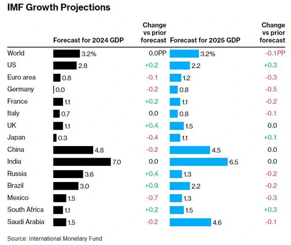 По его словам, "существует геополитический риск, связанный с возможностью эскалации региональных конфликтов", который может повлиять на сырьевые рынки. "Рост протекционизма, протекционистская политика, сбои в торговле также могут повлиять на мировую активность", - отметил Гуриншас. При этом он заявил, что тарифы и торговая неопределенность между странами рискуют снизить уровень мирового экономического производства примерно на 0,5% в 2026 году. Ранее в МВФ выразили обеспокоенность по поводу глобального государственного долга, который может достигнуть 100 триллионов долларов, или 93% мирового ВВП, к концу этого года. Этот рост обусловлен США и Китаем. Фонд призывает правительства принять жесткие решения для стабилизации заимствований. По словам МВФ, в условиях отсутствия политического желания сокращать расходы на фоне необходимости финансирования экологически чистой энергии, поддержки стареющего населения и укрепления безопасности, "риски для перспектив долга сильно смещены в сторону увеличения". Что касается перспектив на 2025 год, то прогноз МВФ для еврозоны был понижен до 1,2%, что на 0,3% ниже, чем в июле, в связи проблемами производственной сферы в Германии и Италии. Прогноз по Мексике был снижен на текущий год больше всего среди крупных экономик, а также на следующий год, исходя из влияния ужесточения денежно-кредитной политики. Прогноз роста для Китая на этот год был снижен до 4,8% с 5% ранее из-за слабого сектора недвижимости и низкого потребительского доверия, при этом прогноз на 2025 год сохранен на уровне 4,5%. Кроме того, Фонд повысил свой прогноз для США на этот год до 2,8% и 2,2% на следующий год благодаря росту потребления. | |
