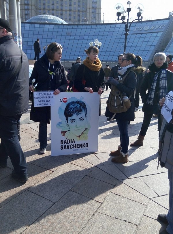 Сегодня, 6 марта, несколько сот человек собрались на "Майдане" в Киеве на акцию в поддержку голодающей в российском СИЗО Надежды Савченко.Собравшиеся держат в руках национальные флаги, портреты Савченко и Тараса Шевченко, а также таблички с хештегом #FreeSavchenko. На акции присутствует Юлия Тимошенко, лидер "Батькивщины", партии, в которой состоит Надежда Савченко. Акция в поддержку украинского парламентария Надежды Савченко проходит и в Харькове, возле памятника Тарасу Шевченко. "Мы пришли сюда, чтобы сказать: Надежда, ты нам нужна! Ты нужна нам здесь, живая!", — сказал инициатор акции Игорь Соломадин. Кроме того, сегодня в Киеве граждане и активисты соберутся под посольством России с требованием немедленно освободить украинскую летчицу, нардепа Надежду Савченко и других украинцев из российского плена, сообщают активисты. "Если до 12:00, 9 марта, Надежду Савченко и других политзаключенных (Николая Карпюка, Олега Сенцова, Станислава Клиха и др.) не освободят из российских застенков, то президент Петр Порошенко обязан немедленно разорвать дипломатические отношения с Россией и выслать дипломатические представительства РФ с территории нашего государства", — требуют организаторы пикета. ![]() ![]()