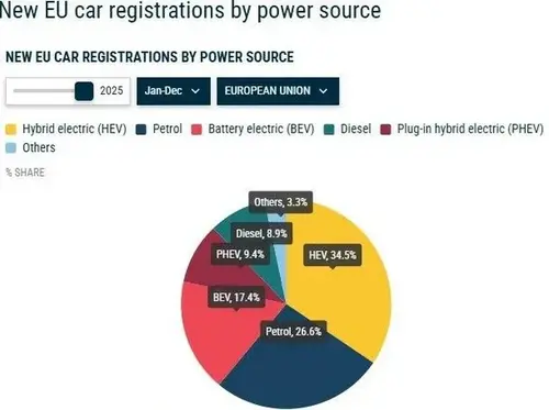 Рынок новых легковых автомобилей в Европейском Союзе в 2025 году вырос на 1,8% по сравнению с предыдущим годом. Об этом сообщает Ассоциация европейских производителей автомобилей (ACEA). В течение года на рынках ЕС было продано более 10,8 миллиона новых машин. Негативная динамика зафиксирована только в сегменте автомобилей с традиционными двигателями. Наибольшую долю рынка новых легковых автомобилей в Евросоюзе занимают гибридные автомобили, на которые пришлось 34,5% продаж. На втором месте находятся бензиновые автомобили (26,6%). Замыкают тройку лидеров электромобили с долей 17,4%. Регистрации новых автомобилей в ЕС в 2025 году по типу питания: