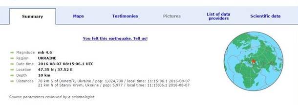 В Восточных областях Украины в воскресенье, 7 августа, произошло землетрясение. В частности, в Мариуполе зафиксированы подземные толчки магнитудой 4,9 балла. Об этом в комментарии УНН сообщила пресс-секретарь ГосЧС в Донецкой области Вероника Бахал."В Мариуполе было землетрясение магнитудой 4,9 балла. Пока информации по поводу пострадавших нет, поскольку из-за землетрясения линии мобильных операторов перегружены", - сообщила Бахал. Также стало известно, что эпицентр землетрясения находился в 21 км от Волновахи. Как сообщили в отделе коммуникации ГСЧС в Запорожской области подземные толчки достались Украины результате землетрясения в Армении. "Сегодня в Запорожье около 11:18 в службу "102" поступили первые обращения от граждан, которые были обеспокоены последствиями землетрясения. Преимущественно, подземные толчки почувствовали жители многоэтажек (5-й этаж и выше) Днепровского, Вознесенского и Александровского районов. Толчки также ощутили и жители Бердянска, Полог, Бильмака и Токмака", - сообщили в ГСЧС По предварительным данным, повреждений жилья и пострадавших нет. Информацию о подземных толчках подтвердили пользователи соцсетей из Донецкой области и Запорожской областей. | |