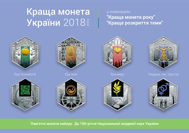 Отмечается, что в номинациях Лучшая монета года и Лучшее раскрытие темы награды присуждены памятным монетам набора К 100-летию Национальной академии наук Украины: Эра мира, Эра перемен, Эра технологий, Человек, время, пространство. Они изготовлены из серебра, а номинал каждой монеты – 5 гривен.