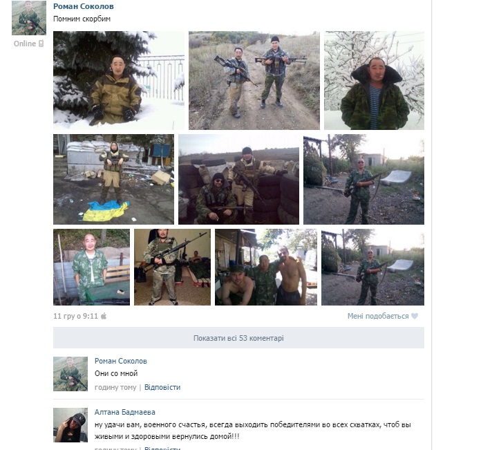 Боевик из российской Калмыкии, воевавший на Донбассе, признался, что с января 2014 года в его группе из 31 человека выжили только четверо.Об этом 24-летний Роман Соколов написал в социальной сети, передают "Новости Донбасса". В группе боевиков воевали 17 уроженцев Калмыкии, написал Соколов. Сам он также в социальной сети обозначил родной город - столицу республики город Элиста. Наибольшие потери его группа понесла в Дебальцево, отметил Соколов в комментарии под фотографиями покойного командира с позывным Бай. Соколов был во время боя в Дебальцево, Горловке Донецкой области, Луганске и Перевальске Луганской области. Такие выводы можно сделать по фотографиям Соколова, опубликованным в социальной сети. Кроме того, сейчас он находится дома, но собирается вернутся в Украину 28 декабря, отметил Соколов в комментариях. Боевик выложил в сеть также фото его покойного командира Бая. Байр Горяев - уроженец Яшкульского района республики Калмыкия. Родился 4 декабря 1980 года. Служил при незаконной вооруженной группировке Всевеликое Войско Донское в Луганской области. Боевик прибыл воевать на Донбасс 26 августа 2015 года. Погиб, предположительно, 6 октября. Тело было найдено 8 ноября. ![]() ![]() ![]()