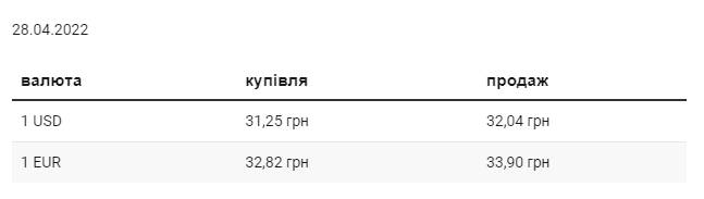 В четверг, 28 апреля, средний курс покупки наличного доллара в украинских банках по сравнению со средой вырос на 0,9 коп. и составляет 31,25 грн. Курс продажи снизился на 12,5 коп. до 32,04 грн. Минимальный курс покупки доллара в банках составил – 29,25 грн, максимальный – 32,1 грн. Для продажи минимальный курс – 29,55 грн, максимальный – 32,18 грн. Средний курс покупки евро снизился на 26,87 коп. и составляет 32,82 грн. Средний курс продаж упал на 42,34 коп. и составляет 33,9 грн. Минимальный курс покупки для евро составил – 30,97 грн, максимальный – 34 грн. Для продажи минимальный курс – 31,27 грн, максимальный – 34,3 грн. | |