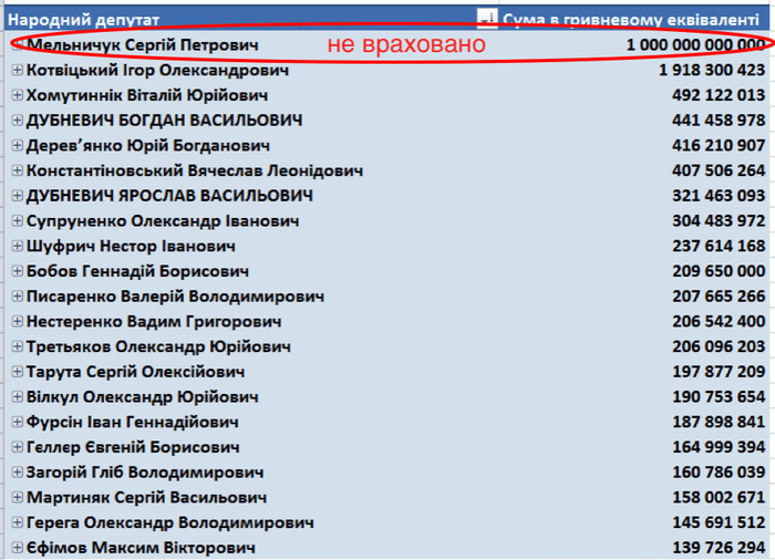 Народные депутаты задекларировали в общей сложности почти 12 млрд грн. Об этом сообщается на официальном сайте Гражданской сети ОПОРА."Мы воспользовались API (автоматизированным прикладным интерфейсом) реестра и подсчитали общую сумму категории "Денежные активы" для семей народных депутатов. Если не учитывать задекларированную скандальную сумму депутатом Сергеем Мельничуком в размере одного триллиона гривень наличных средств, то задекларированная другими 412 депутатами сумма составляет почти 12 миллиардов. При подсчете мы также учли, что депутат Наталья Королевская и депутат Юрий Солод являются женой и мужем, соответственно денежные активы их семьи были указаны дважды в двух декларациях, и мы устранили это дублирование", – говорится в сообщении. Также, в ОПОРЕ сообщают, что в ТОП-10 по сумме денежных активов задекларированных семьями депутатов вошли: