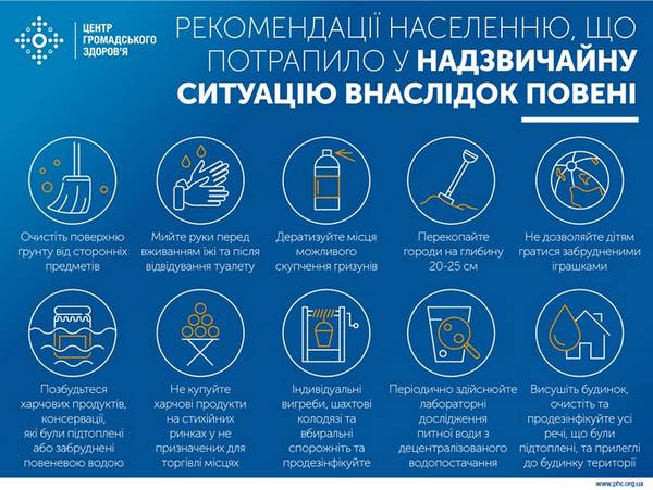 В условиях наводнений и паводков, которые вызывают подтопления домов, сельскохозяйственных угодий, навозохранилищ, свалок, повышается риск вспышек инфекционных болезней и пищевых отравлений. Об этом сообщает в Facebook Центр общественного здоровья.Медики предупреждают о реальной угрозе загрязнения питьевой воды возбудителями вирусного гепатита А, брюшного тифа, дизентерии, энтеровирусной инфекции и других инфекционных болезней, и призывают соблюдать правила профилактики. Людям рекомендуют обязательно кипятить питьевую воду, овощи и фрукты хорошо промывать питьевой водой, а для потребления детьми – обдавать кипятком, соблюдать правила личной гигиены. ![]() | |
