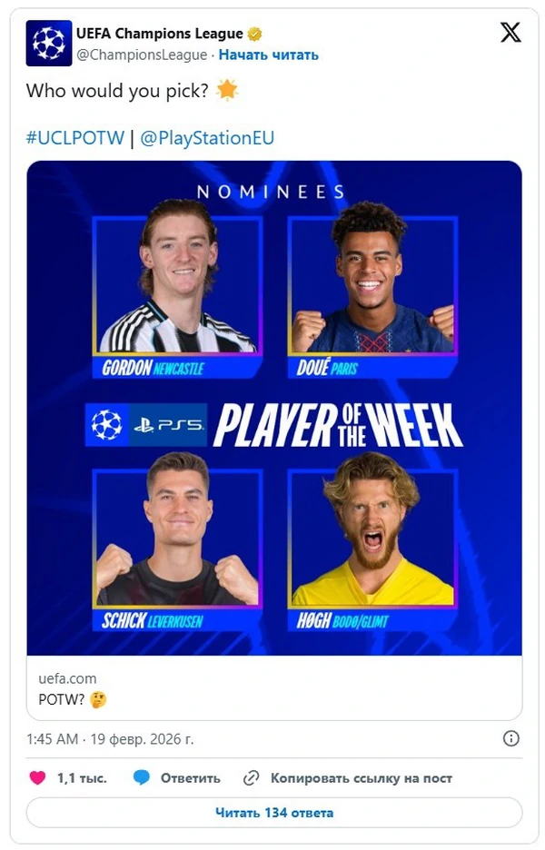 УЕФА объявил претендентов на звание лучшего игрока недели в Лиге чемпионов по результатам первых стыковых матчей этого престижного еврокубка. Отмечается, что на награду подали заявки четыре кандидата, голосование за которых проводится на официальном сайте Европейского футбольного союза. Претенденты на звание игрока недели в Лиге чемпионов: