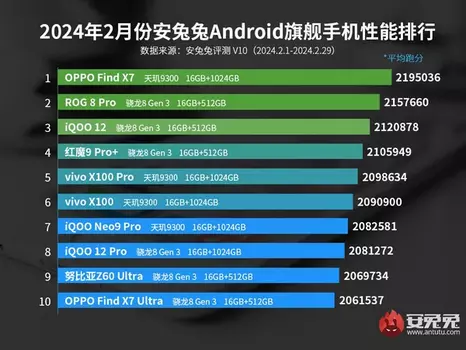 AnTuTu обновил свой рейтинг производительности флагманских Android-смартфонов. Интересно, что на этот раз ни одна из новых моделей Xiaomi не вошла в топ. Об этом пишет сайт бенчмарка AnTuTu. Таким образом, в феврале самым производительным устройством признали Oppo Find X7, оснащенный чипом MediaTek Dimensity 9300. На втором месте расположился Asus ROG Phone 8 Pro, а на третьем - iQOO 12, оба работают на базе Snapdragon 8 Gen 3. 10 самых мощных Android-флагманов в феврале 2024 года