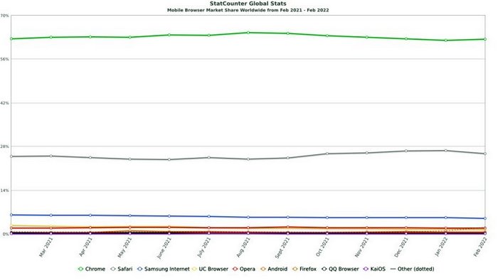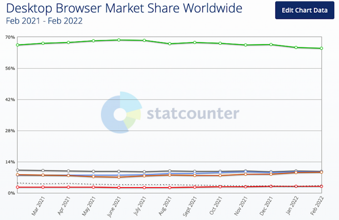 Аналитическая компания StatCounter обновила статистику использования браузеров для различных платформ, сообщает 4PDA. Наибольшая борьба развернулась на ПК-рынке — по мнению аналитиков, у Microsoft есть все шансы потеснить Apple в рейтинге популярности приложений для веб-сёрфинга. Лидером десктопного сегмента, как и прежде, остался Google Chrome. К февралю 2022-го его популярность несколько снизилась, но по-прежнему составляет внушительные 64,92%. На втором месте расположился Apple Safari (9,75%), который с трудом оторвался от занимающего третью строчку Microsoft Edge с показателем в 9,56%. Замыкают топ-5 Mozilla Firefox и Opera — 9,41% и 2,41% соответственно. В мобильном сегменте также лидирует браузер Google (62,36%). У этой версии Safari дела обстоят куда лучше, чем у десктопной — она занимает больше четверти рынка браузеров для смартфонов и планшетов (25,67%). Третье место у Samsung Internet, который стал основным для 4,98% пользователей. Показатели всех остальных приложений значительно ниже, и не дотягивают даже для двухпроцентной отметки. | |