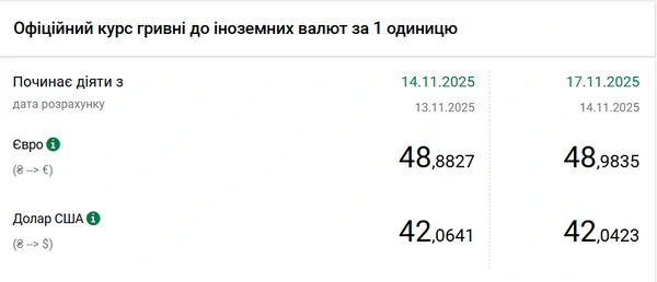 Национальный банк Украины (НБУ) снизил курс доллара к гривне – на 2 копейки. Об этом сообщает РБК-Украина со ссылкой на данные на сайте регулятора. Официальный курс доллара на 17 ноября 2025 года установлен на таком уровне: 42,0423 гривен за 1 доллар (-0,02 грн). Официальный курс евро составляет 48,9835 гривен за 1 евро (-0,10 грн).