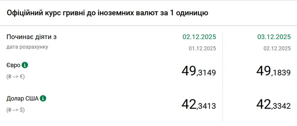 Национальный банк Украины (НБУ) снизил курс доллара к гривне – на 1 копейку. Об этом сообщает РБК-Украина со ссылкой на данные на сайте регулятора. Официальный курс доллара на 3 декабря 2025 года установлен на таком уровне: 42,3342 гривен за 1 доллар (-0,01 грн). Официальный курс евро составляет 49,1839 гривен за 1 евро (-0,13 грн).