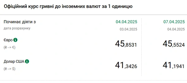 Национальный банк Украины (НБУ) снизил курс доллара к гривне. Доллар подешевел до минимума с середины октября 2024 года. Об этом сообщает РБК-Украина со ссылкой на данные на сайте регулятора. Официальный курс на 7 апреля 2025 года установлен на таком уровне: 41,1941 гривен за 1 доллар (-0,1485 грн). Ниже курс был только 14 октября прошлого года - 41,1891 грн/доллар. Официальный курс евро составит 45,5524 гривен за 1 евро (-0,3007 грн).