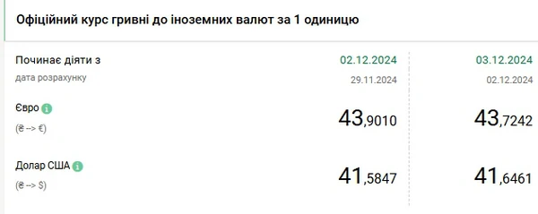 Национальный банк Украины (НБУ) повысил курс доллара к гривне. Доллар снова обновил исторический максимум. Об этом сообщает РБК-Украина со ссылкой на данные на сайте регулятора. Официальный курс на 3 декабря 2024 года установлен на таком уровне: 41,6461 гривен за 1 доллар (+0,0614 грн). Предыдущий максиму был зафиксирован 28 ноября - 41,6010 грн/доллар. С начала года доллар подорожал на 9,6% (с 37,9824 на 31 декабря 2023 года). Официальный курс евро составит 43,7242 гривен за 1 евро (-0,1768 грн).