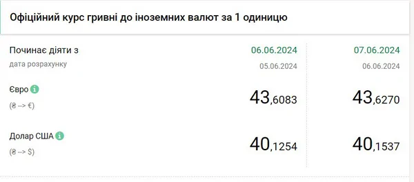 Национальный банк Украины (НБУ) немного повысил курс доллара по сравнению с предыдущим днем. Тренд изменился, и американская валюта перешла к росту после того, как снижалась с начала недели. Об этом сообщает РБК-Украина со ссылкой на данные на сайте регулятора. Официальный курс на 7 июня 2024 года установлен на уровне 40,1537 гривен за 1 доллар (+0,0283 грн). До этого доллар снижался три дня подряд, оттолкнувшись от исторического максимума в 40,53 гривен. Официальный курс евро установлен на отметке 43,6270 гривен за 1 евро (+0,0187 грн). Единая европейская валюта тоже укрепилась после того, как курс снижался параллельно с долларом.