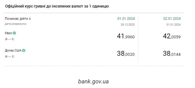 Национальный банк Украины (НБУ) снова повысил курс доллара по итогам торгов на межбанке. Доллар подорожал до нового исторического максимума. Об этом сообщает РБК-Украина со ссылкой на данные на сайте регулятора. Официальный курс на 2 января 2024 года установлен на таком уровне: 38,0144 гривен за 1 доллар (+0,0124 грн). Курс евро составит 42,0059 гривен за 1 евро (+0,0099 грн). На межбанке сегодня курс упал на 3 копейки до 37,92-37,99 грн/доллар (покупка-продажа). На наличном рынке курс вырос на 45 копеек до 39,50 грн/доллар. | |