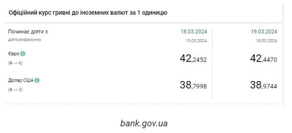 Национальный банк Украины (НБУ) снова повысил курс доллара к гривне до исторического максимума. Об этом сообщает РБК-Украина со ссылкой на данные на сайте регулятора. Официальный курс на 19 марта 2024 года установлен на таком уровне: 38,9744 гривен за 1 доллар (+0,1746 грн). Предыдущий максимум был зафиксирован только 18 марта - 38,7998 гривен за 1 доллар. Курс евро составит 42,447 гривен за 1 евро (+0,2018 грн), что также является максимумом. Предыдущий рекорд был 14 марта - 42,4183 гривен. На межбанке сегодня курс вырос на 19 копеек до 38,98-39,00 грн/доллар (покупка-продажа) по сравнению с закрытием в предыдущий день. На наличном рынке курс вырос на 40 копеек до 39,15 грн/доллар. | |