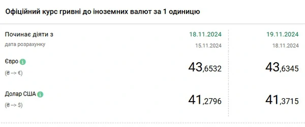 Национальный банк Украины (НБУ) повысил курс доллара к гривне. Доллар дорожает второй день подряд. Об этом сообщает РБК-Украина со ссылкой на данные на сайте регулятора. Официальный курс на 19 ноября 2024 года установлен на таком уровне: 41,3715 гривен за 1 доллар (+0,0919 грн). Официальный курс евро составит 43,6345 гривен за 1 евро (-0,0187 грн).