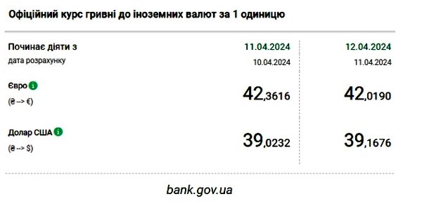 Национальный банк Украины (НБУ) повысил курс доллара к гривне. Доллар дорожает четвертый день подряд. Об этом сообщает РБК-Украина со ссылкой на данные на сайте регулятора. Официальный курс на 12 апреля 2024 года установлен на таком уровне: 39,1676 гривен за 1 доллар (+0,1444 грн). Курс евро составит 42,019 гривен за 1 евро (-0,3426 грн).