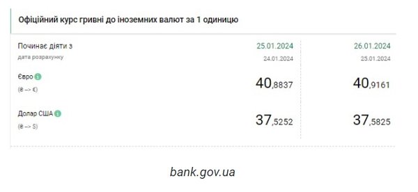 Национальный банк Украины (НБУ) снова повысил курс доллара. Доллар дорожает третий день подряд после падения в течение недели. Об этом сообщает РБК-Украина со ссылкой на данные на сайте регулятора. Официальный курс на 26 января 2024 года установлен на таком уровне: 37,5825 гривен за 1 доллар (+0,0573 грн). Курс евро составит 40,9161 гривен за 1 евро (+0,0324 грн). На межбанке сегодня курс вырос на 9 копеек до 37,57-37,59 грн/доллар (покупка-продажа) по сравнению с закрытием в предыдущий день. На наличном рынке курс в продаже вырос на 10 копеек до 38,30 грн/доллар. | |