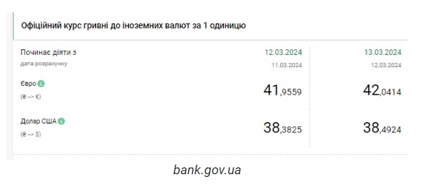 Национальный банк Украины (НБУ) повысил курс доллара. Доллар дорожает третий день подряд. Об этом сообщает РБК-Украина со ссылкой на данные на сайте регулятора. Официальный курс на 13 марта 2024 года установлен на таком уровне: 38,4924 гривен за 1 доллар (+0,1099 грн). Курс евро составит 42,0414 гривен за 1 евро (+0,0855 грн). На межбанке сегодня курс вырос на 14 копеек до 38,50-38,57 грн/доллар (покупка-продажа) по сравнению с закрытием в предыдущий день. На наличном рынке курс вырос на 10 копеек до 38,65 грн/доллар. | |