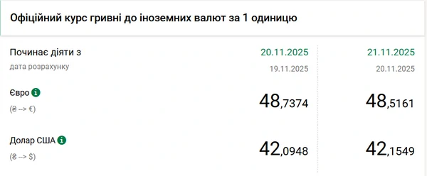 Национальный банк Украины (НБУ) повысил курс доллара к гривне. Стоимость валюты США осталась увеличилась на 6 копеек. Об этом сообщает РБК-Украина со ссылкой на данные на сайте регулятора. Официальный курс доллара на 21 ноября 2025 года установлен на таком уровне: 42,1549 гривны за 1 доллар. С начала года доллар подорожал на 13 копеек: 1 января 2025 года он стоил 42,02 грн. С начала ноября рост американской валюты составил 18 копеек – в первый день месяца курс был на уровне 41,97 гривны за доллар. Официальный курс евро на 21 ноября установлен на отметке 48,5161 гривны. Европейская валюта ослабла: по сравнению с 20 ноября ее стоимость снизилась на 22 копейки.