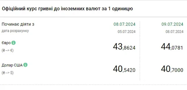 Национальный банк Украины (НБУ) повысил курс доллара к гривне. Курс евро обновил исторический максимум. Об этом сообщает РБК-Украина со ссылкой на данные на сайте регулятора. Официальный курс на 9 июля 2024 года установлен на таком уровне: 40,7000 гривен за 1 доллар (+0,1580 грн). Курс евро составит 44,0781 гривен за 1 евро (+0,2157 грн). Это исторический максимум. Выше курс был только 3 июня - 43,9850.