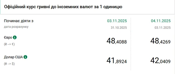 Национальный банк Украины (НБУ) повысил курс доллара к гривне – на 15 копеек. Об этом сообщает РБК-Украина со ссылкой на данные на сайте регулятора. Официальный курс доллара на 4 ноября 2025 года установлен на таком уровне: 42,0409 гривны за 1 доллар (+0,15 грн). НБУ вновь повысил курс доллара после того, как несколько дней подряд американская валюта дешевела по отношению к гривне. С начала года курс доллара повысился на 2 копейки. 1 января 2025 года американская валюта стоила 42,02 гривны. При этом с 1 октября доллар вырос на 90 копеек. В начале месяца его стоимость составляла 41,14 гривны. Официальный курс евро на 4 ноября составляет 48,4269 гривны. Единая европейская валюта также дорожала. Ее цена повысилась на 2 копейки.