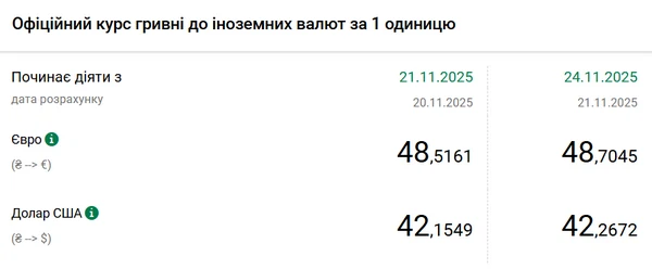 Национальный банк Украины (НБУ) повысил курс доллара к гривне. Стоимость валюты США увеличилась на 11 копеек. Об этом сообщает РБК-Украина со ссылкой на данные на сайте регулятора. Официальный курс доллара на 24 ноября 2025 года установлен на таком уровне: 42,2672 гривны за 1 доллар. С начала года доллар подорожал на 24 копейки: 1 января 2025 года он стоил 42,02 грн. С начала ноября рост американской валюты составил 29 копеек – в первый день месяца курс был на уровне 41,97 гривны за доллар. Официальный курс евро на 24 ноября установлен на отметке 48,7045 гривны. Европейская валюта также подорожала: по сравнению с 21 ноября ее стоимость повысилась на 19 копеек.