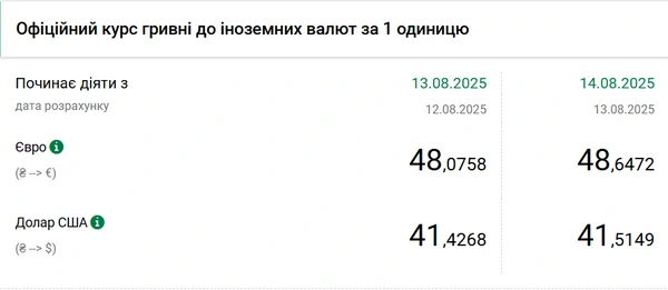 Национальный банк Украины (НБУ) немного повысил курс доллара к гривне – на 9 копеек. Об этом сообщает РБК-Украина со ссылкой на данные на сайте регулятора. Официальный курс доллара на 14 августа 2025 года установлен на таком уровне: 41,5149 гривен за 1 доллар (+0,0881 грн). Официальный курс евро составляет 48,6472 гривен за 1 евро (+0,5714 грн).