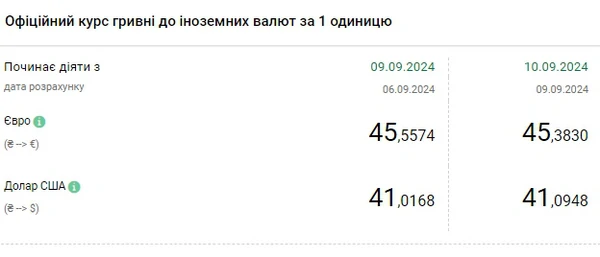 Национальный банк Украины (НБУ) повысил курс доллара к гривне. Доллар подрожал после достижения минимума за последний месяц. Об этом сообщает РБК-Украина со ссылкой на данные на сайте регулятора. Официальный курс на 10 сентября 2024 года установлен на таком уровне: 41,0948 гривен за 1 доллар (+0,0780 грн). Курс евро составит 45,383 гривен за 1 евро (-0,1744 грн).