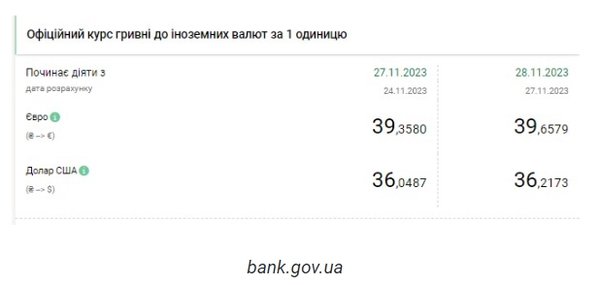 Национальный банк Украины (НБУ) снова повысил курс доллара. Доллар дорожает второй день подряд после недельного снижения. Об этом сообщает РБК-Украина со ссылкой на данные на сайте регулятора. Официальный курс на 28 ноября 2023 года установлен на таком уровне: 36,2173 гривен за 1 доллар (+0,1686 грн). Курс евро составит 339,6579 гривен за 1 евро (+0,2999 грн). На межбанке сегодня курс вырос на 21 копейку до 36,27-36,29 грн/доллар (покупка-продажа). На наличном рынке курс упал на 5 копеек до 37,60 гривен за доллар. | |