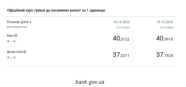Национальный банк Украины (НБУ) снова повысил курс доллара. Подорожание валюты вызвано сезонным ростом спроса. Об этом сообщает РБК-Украина со ссылкой на данные на сайте регулятора. Официальный курс на 19 декабря 2023 года установлен на таком уровне: 37,1924 гривен за 1 доллар (+0,1713 грн). Курс евро составит 40,5918 гривен за 1 евро (+0,0796 грн). Курс определяется котировками на международном рынке пары евро/доллар и не зависит от НБУ. На межбанке сегодня курс вырос на 15 копеек до 37,17-37,19 грн/доллар (покупка-продажа). На наличном рынке курс не изменился - 37,60 гривен за доллар. | |