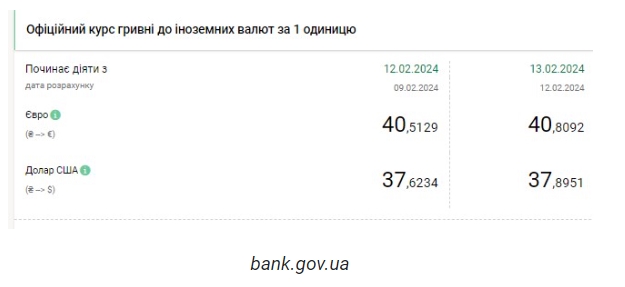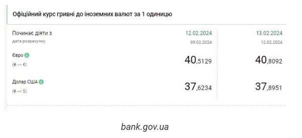 Национальный банк Украины (НБУ) резко повысил курс доллара. Доллар дорожает после стабильности на прошлой неделе. Об этом сообщает РБК-Украина со ссылкой на данные на сайте регулятора. Официальный курс на 13 февраля 2024 года установлен на таком уровне: 37,8951 гривен за 1 доллар (+0,2717 грн). Курс евро составит 40,8092 гривен за 1 евро (+0,2963 грн). На межбанке сегодня курс вырос на 24 копейки до 37,90-37,93 грн/доллар (покупка-продажа) по сравнению с закрытием в предыдущий день. На наличном рынке курс вырос на 15 копеек до 38,20 грн/доллар. | |