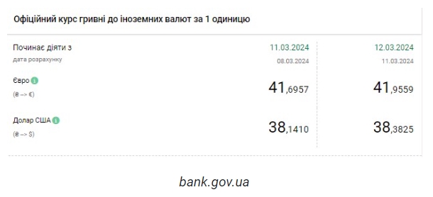 Национальный банк Украины (НБУ) повысил курс доллара. Доллар дорожает второй день подряд. Об этом сообщает РБК-Украина со ссылкой на данные на сайте регулятора. Официальный курс на 12 марта 2024 года установлен на таком уровне: 38,3825 гривен за 1 доллар (+0,2415 грн). Курс евро составит 41,9559 гривен за 1 евро (+0,2602 грн). На межбанке сегодня курс вырос на 25 копеек до 38,39-38,43 грн/доллар (покупка-продажа) по сравнению с закрытием в предыдущий день. На наличном рынке курс вырос на 10 копеек до 38,55 грн/доллар. | |