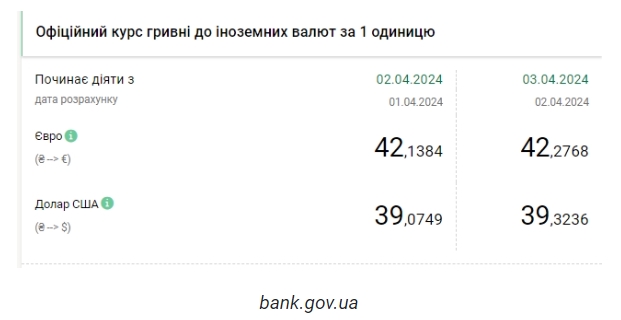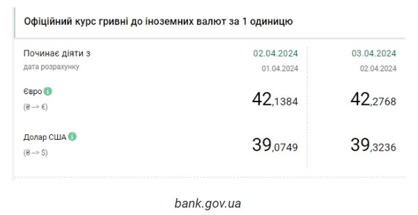 Национальный банк Украины (НБУ) повысил курс доллара к гривне. Доллар дорожает второй день подряд. Об этом сообщает РБК-Украина со ссылкой на данные на сайте регулятора. Официальный курс на 3 апреля 2024 года установлен на таком уровне: 39,3236 гривен за 1 доллар (+0,2487 грн). Курс евро составит 42,2768 гривен за 1 евро (+0,1384 грн). На межбанке курс вырос на 21 копейку до 39,32-39,34 грн/доллар (покупка-продажа) по сравнению с закрытием в предыдущий день. На наличном рынке курс вырос на 10 копеек до 39,50 грн/доллар. | |