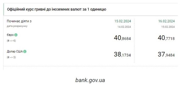 Национальный банк Украины (НБУ) снизил курс доллара. Доллар подешевел после четырех дней роста. Об этом сообщает РБК-Украина со ссылкой на данные на сайте регулятора. Официальный курс на 16 февраля 2024 года установлен на таком уровне: 37,9484 гривен за 1 доллар (-0,2250 грн). Курс евро составит 40,7718 гривен за 1 евро (-0,0966 грн). На межбанке сегодня курс упал на 25 копеек до 37,88-38,91 грн/доллар (покупка-продажа) по сравнению с закрытием в предыдущий день. На наличном рынке курс упал на 10 копеек до 38,30 грн/доллар. | |