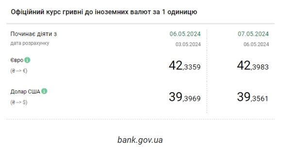 Национальный банк Украины (НБУ) снизил курс доллара к гривне. Доллар дешевеет третий день подряд. Об этом сообщает РБК-Украина со ссылкой на данные на сайте регулятора. Официальный курс на 7 мая 2024 года установлен на таком уровне: 39,3561 гривен за 1 доллар (-0,0408 грн). Курс евро составит 42,3983 гривен за 1 евро (+0,0624 грн). На межбанке курс упал на 9 копеек до 39,20-39,30 грн/доллар (покупка-продажа) по сравнению с закрытием в предыдущий день. На наличном рынке курс не изменился - 39,85 грн/доллар. | |
