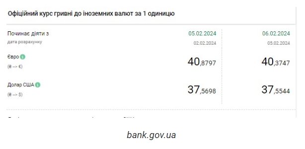Национальный банк Украины (НБУ) снизил курс доллара. Доллар дешевеет второй день подряд. Об этом сообщает РБК-Украина со ссылкой на данные на сайте регулятора. Официальный курс на 6 февраля 2024 года установлен на таком уровне: 37,5544 гривен за 1 доллар (-0,0154 грн). Курс евро составит 40,3747 гривен за 1 евро (-0,5050 грн). На межбанке сегодня курс вырос на 5 копеек до 37,55-37,57 грн/доллар (покупка-продажа) по сравнению с закрытием в предыдущий день. На наличном рынке курс упал на 10 копеек до 38,05 грн/доллар. | |