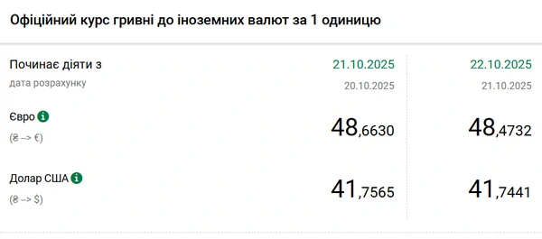 Национальный банк Украины (НБУ) снизил курс доллара к гривне. Доллар подешевел после двух дней роста. Об этом сообщает РБК-Украина со ссылкой на данные на сайте регулятора. Официальный курс на 22 октября 2025 года установлен на таком уровне: 41,7441 гривен за 1 доллар (-0,0124 грн). Официальный курс евро составит 48,4732 гривен за 1 евро (-0,1898 грн).