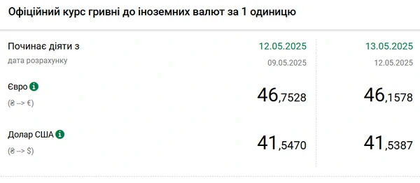 Национальный банк Украины (НБУ) снизил курс доллара к гривне. Курс евро упал почти на 60 копеек. Об этом сообщает РБК-Украина со ссылкой на данные на сайте регулятора. Официальный курс на 13 мая 2025 года установлен на таком уровне: 41,5387 гривен за 1 доллар (-0,0083 грн). Официальный курс евро составит 46,1578 гривен за 1 евро (-0,5950 грн).