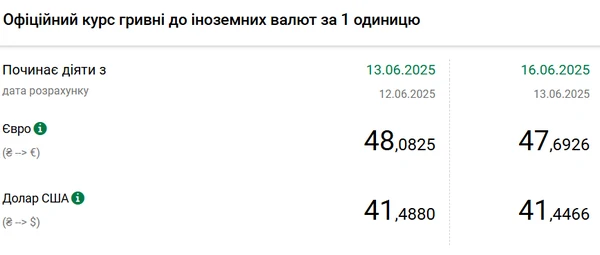 Национальный банк Украины (НБУ) снизил курс доллара к гривне. Курс евро упал после исторического максимума. Об этом сообщает РБК-Украина со ссылкой на данные на сайте регулятора. Официальный курс на 16 июня 2025 года установлен на таком уровне: 41,4466 гривен за 1 доллар (-0,0414 грн). Официальный курс евро составит 47,6926 гривен за 1 евро (-0,3899 грн).