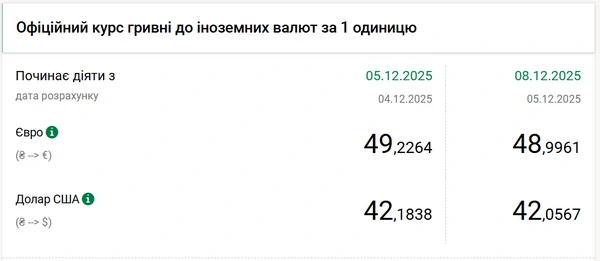 Национальный банк Украины (НБУ) снизил курс доллара к гривне – на 13 копеек. Об этом сообщает РБК-Украина со ссылкой на данные на сайте регулятора. Официальный курс доллара на 8 декабря 2025 года установлен на таком уровне: 42,0567 гривен за 1 доллар (-0,13 грн). Официальный курс евро составляет 48,9961 гривен за 1 евро (-0,23 грн).