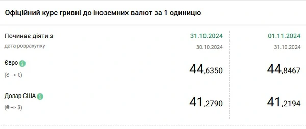 Национальный банк Украины (НБУ) снизил курс доллара к гривне. Доллар дешевеет второй день подряд. Об этом сообщает РБК-Украина со ссылкой на данные на сайте регулятора. Официальный курс на 1 ноября 2024 года установлен на таком уровне: 41,2194 гривен за 1 доллар (-0,0596 грн). Курс евро составит 44,8467 гривен за 1 евро (+0,2117 грн).