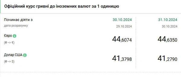 Национальный банк Украины (НБУ) снизил курс доллара к гривне. Доллар подешевел после роста три дня подряд. Об этом сообщает РБК-Украина со ссылкой на данные на сайте регулятора. Официальный курс на 31 октября 2024 года установлен на таком уровне: 41,2790 гривен за 1 доллар (-0,1008 грн). Курс евро составит 44,635 гривен за 1 евро (+0,0276 грн).