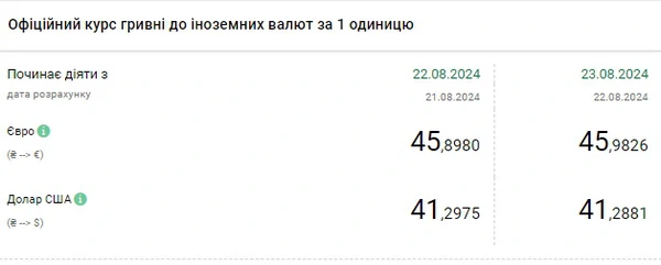 Национальный банк Украины (НБУ) снизил курс доллара к гривне. Доллар дешевеет второй день подряд. Об этом сообщает РБК-Украина со ссылкой на данные на сайте регулятора. Официальный курс на 23 августа 2024 года установлен на таком уровне: 41,2881 гривен за 1 доллар (-0,0094 грн). Курс евро составит 45,9826 гривен за 1 евро (-0,084 грн). Это исторический максимум, предыдущий был 22 августа - 45,898.