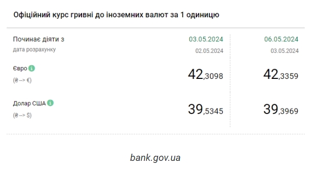 Национальный банк Украины (НБУ) снизил курс доллара к гривне. Доллар дешевеет второй день подряд. Об этом сообщает РБК-Украина со ссылкой на данные на сайте регулятора. Официальный курс на 6 мая 2024 года установлен на таком уровне: 39,3969 гривен за 1 доллар (-0,1376 грн). Курс евро составит 42,3359 гривен за 1 евро (+0,0261 грн). На межбанке курс упал на 13 копеек до 39,34-39,39 грн/доллар (покупка-продажа) по сравнению с закрытием в предыдущий день. На наличном рынке курс упал на 5 копеек до 39,85 грн/доллар. | |