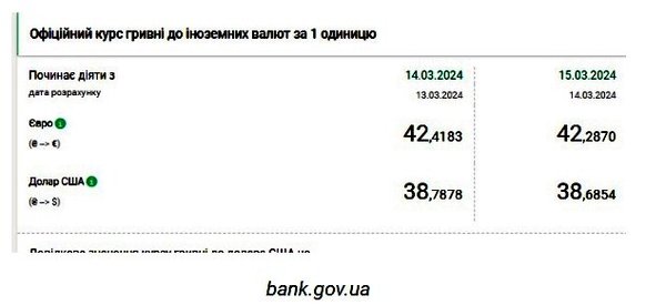 Национальный банк Украины (НБУ) снизил курс доллара. Курс упал после достижения исторического максимума накануне. Об этом сообщает РБК-Украина со ссылкой на данные на сайте регулятора. Официальный курс на 15 марта 2024 года установлен на таком уровне: 38,6854 гривен за 1 доллар (-0,1024 грн). Курс евро составит 42,287 гривен за 1 евро (-0,1313 грн). На межбанке сегодня курс упал на 12 копеек до 38,65-38,68 грн/доллар (покупка-продажа) по сравнению с закрытием в предыдущий день. На наличном рынке курс не изменился - 38,90 грн/доллар. | |